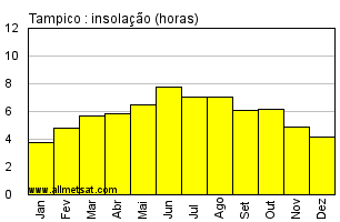 | Média mensal do número de horas de sol por dia. |